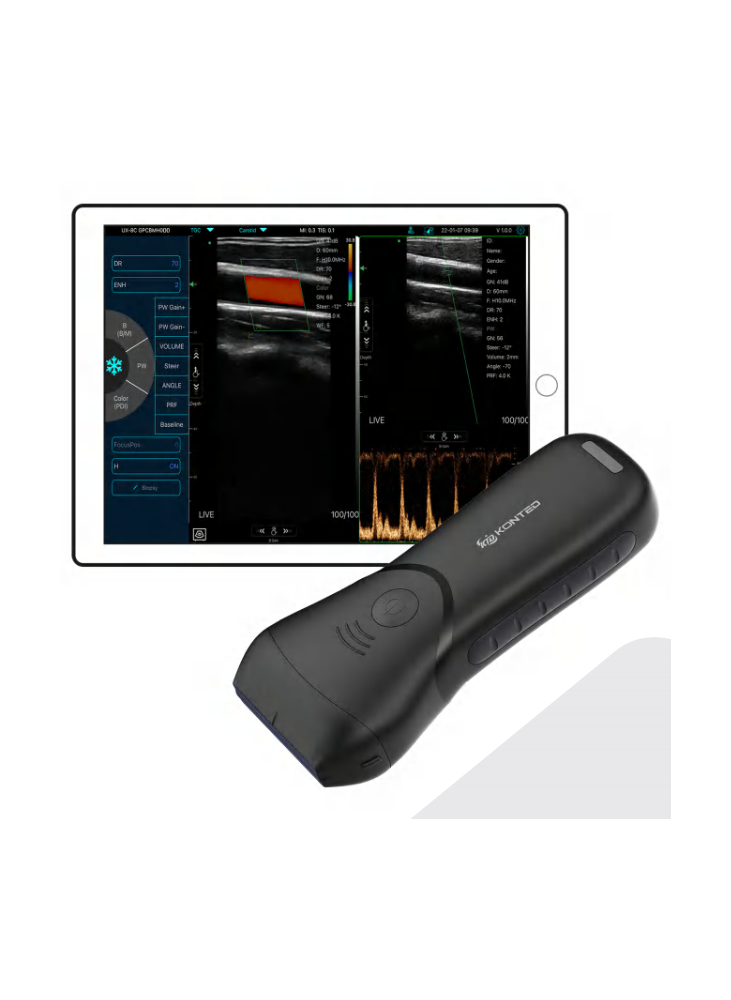 L'échographe personnel eCHOVASCUGENIUS est une sonde ultraportable de haute fréquence. Elle est fonctionnelle 5 secondes après avoir été allumée.